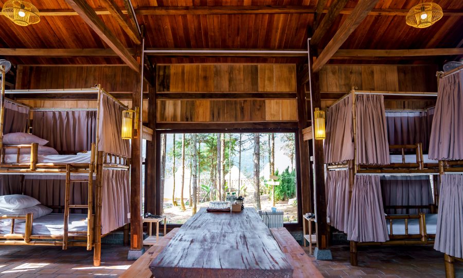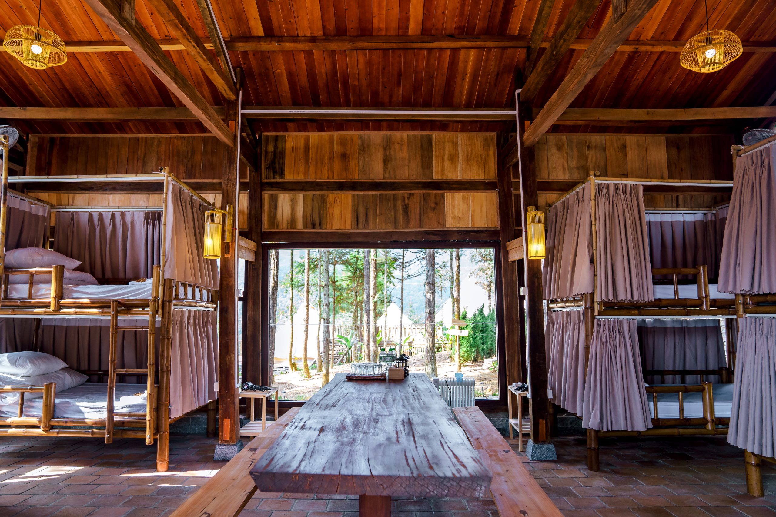 Không gian rộng rãi, thoáng đãng, có thể phục vụ lên tới 12 khách (người lớn hoặc trẻ em) cùng lúc, phù hợp cho nhóm bạn, gia đình lớn hoặc khách lẻ mong muốn trải nghiệm sinh hoạt tập thể. Bên trong được bố trí giường tầng bằng mây tre tự nhiên hoặc đệm sàn gọn gàng, có đầy đủ tiện nghi cơ bản như quạt, đèn đọc sách, tủ đồ cá nhân và wifi.